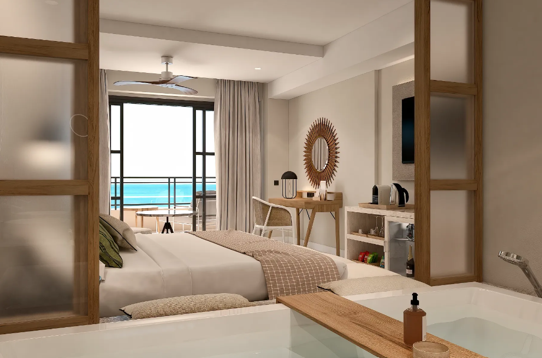 - Distribución de la Habitación: La Junior Suite Partial Ocean View e está equipada con 1 cama king o 2 camas queens perfectas para alojar hasta la capacidad de 3 adultos, la misma puede tener balcón y/o terrazas privados amueblados con vista panorámicas sujetos a disponibilidad garantizando una estancia placentera con espacio y comodidad e inigualable.